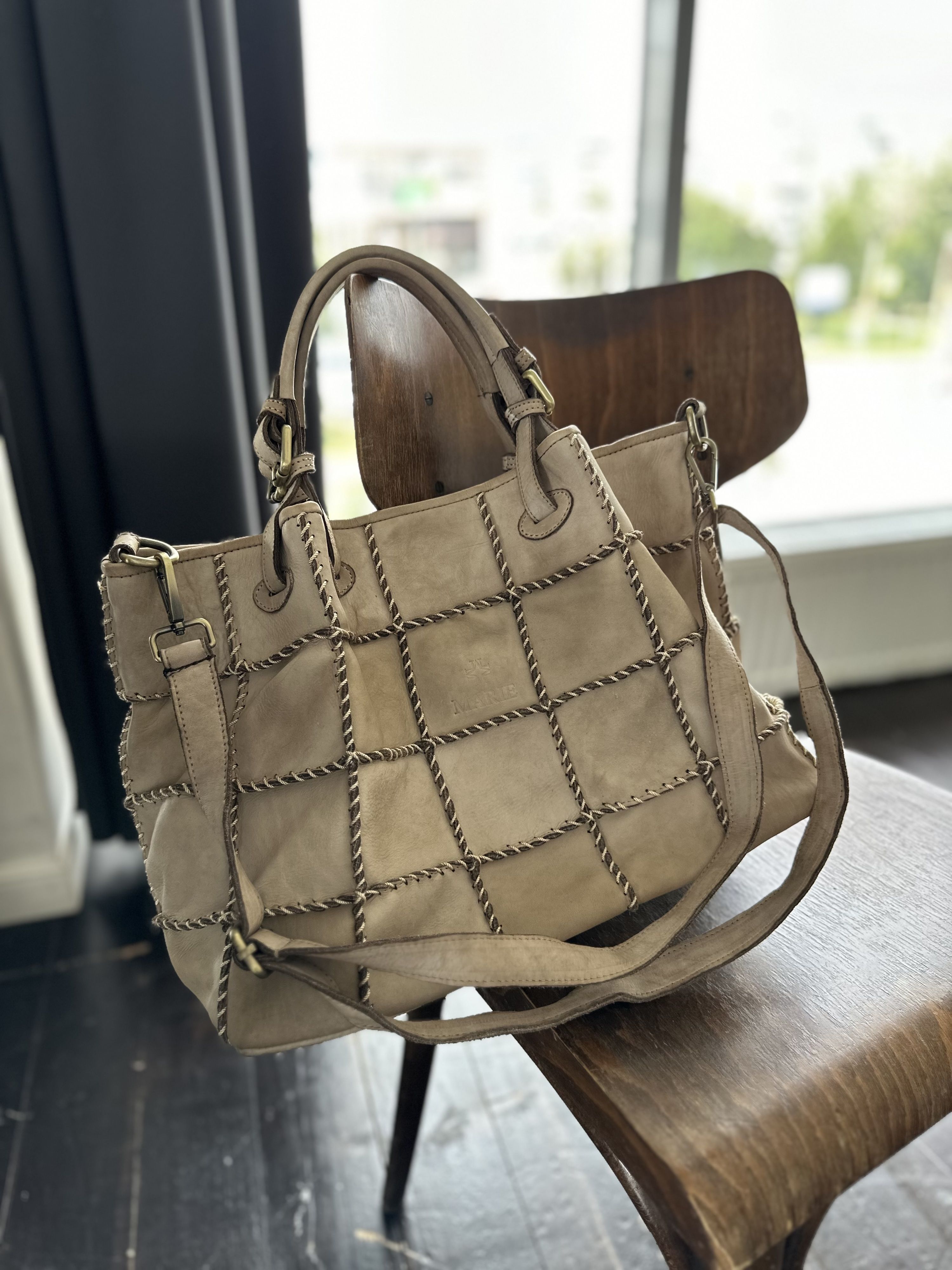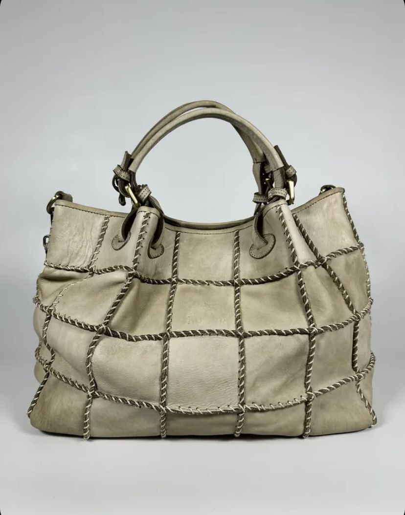 Женская сумка итальянского производства выполнена из натуральной лицевой вареной кожи в ласкутной технике с внешней обработкой шва.
